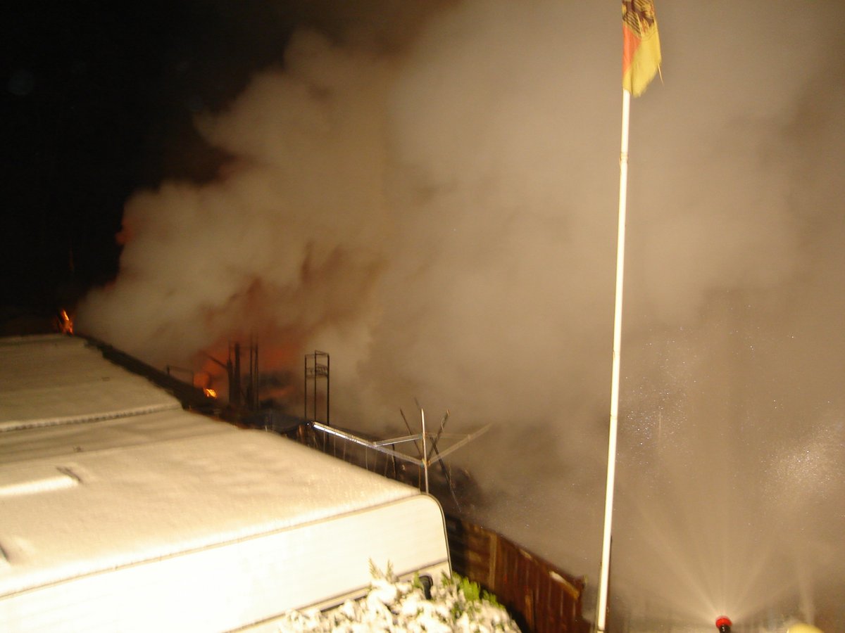 Aus noch ungeklärter Ursache war es zu einem Brand gekommen, der sich schnell auf umliegende Wohnwagen und Bebauungen ausweitete. Die ersten Einsatzkräfte konnten schon auf der Anfahrt einen riesigen Feuerschein sehen und die Alarmierung entsprechend erhöhen.