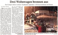 Zu einem Wohnwagenbrand auf dem Campingplatz Sonnenwiese rückten am Donnerstagabenzahlreiche Einsatzkräfte der Feuerwehr, des Rettungsdienstes, der Hilforganisationen sowie des THW aus.