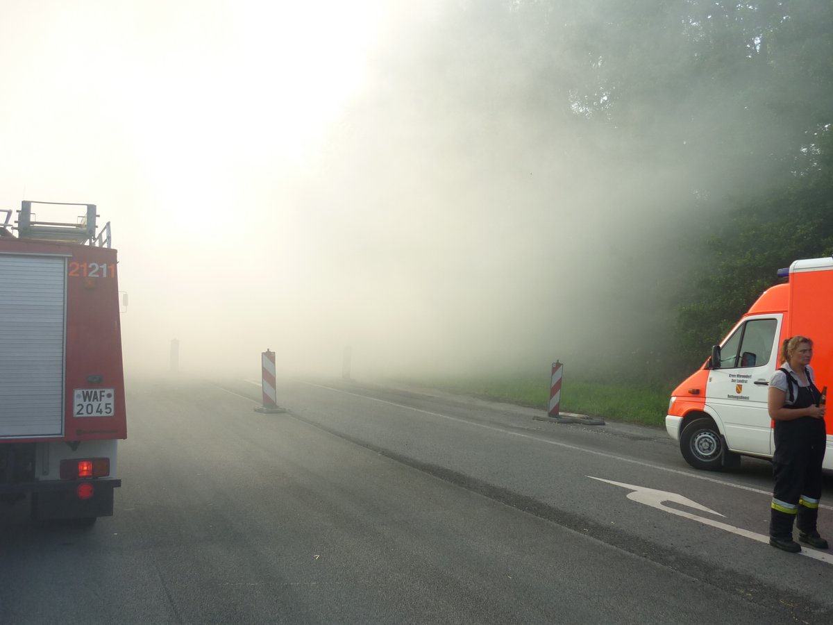 Da der Brand am hinteren Wagen ausbrach, bemerkte der Fahrer das Feuer erst spät. Zu diesem Zeitpunkt hatten die Flammen bereits auf die gesamte Ladung übergegriffen. Außerdem waren Teile des Strohs brennend auf die Bundesstraße gefallen. Er bog von der Bundesstraße in Richtung Lauheide ab und blieb dort stehen.