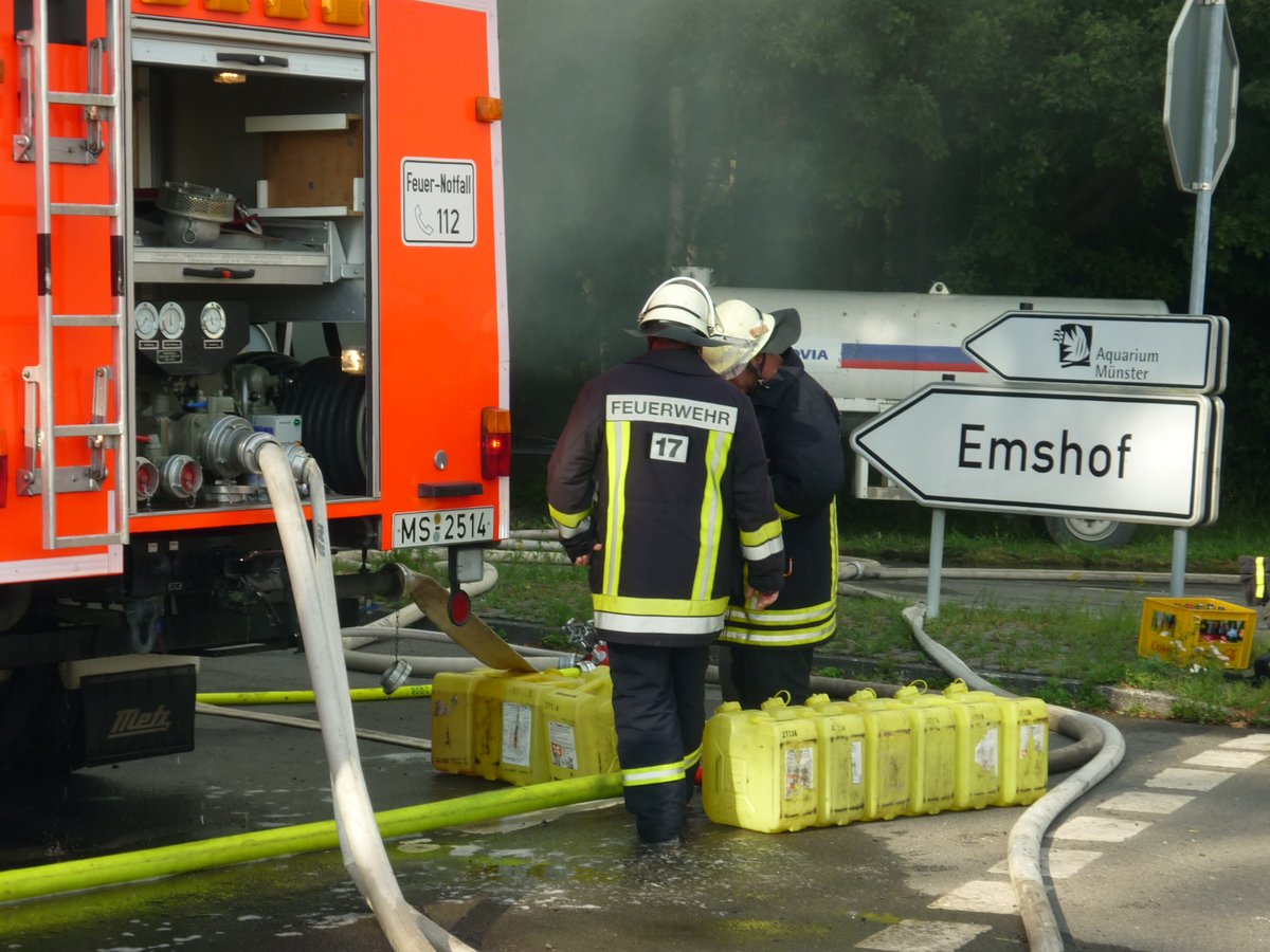 Die Bundesstraße wurde in beide Richtungen von den Polizeikräften aus Münster und Warendorf abgesperrt. Weiterhin wurde die Hans-Geigerstraße, die durch das Gewerbegebiet Kiebitzpohl führt abgesperrt. Hier wurden die im Pendelverkehr eingesetzten Tanklöschfahrzeuge befüllt.