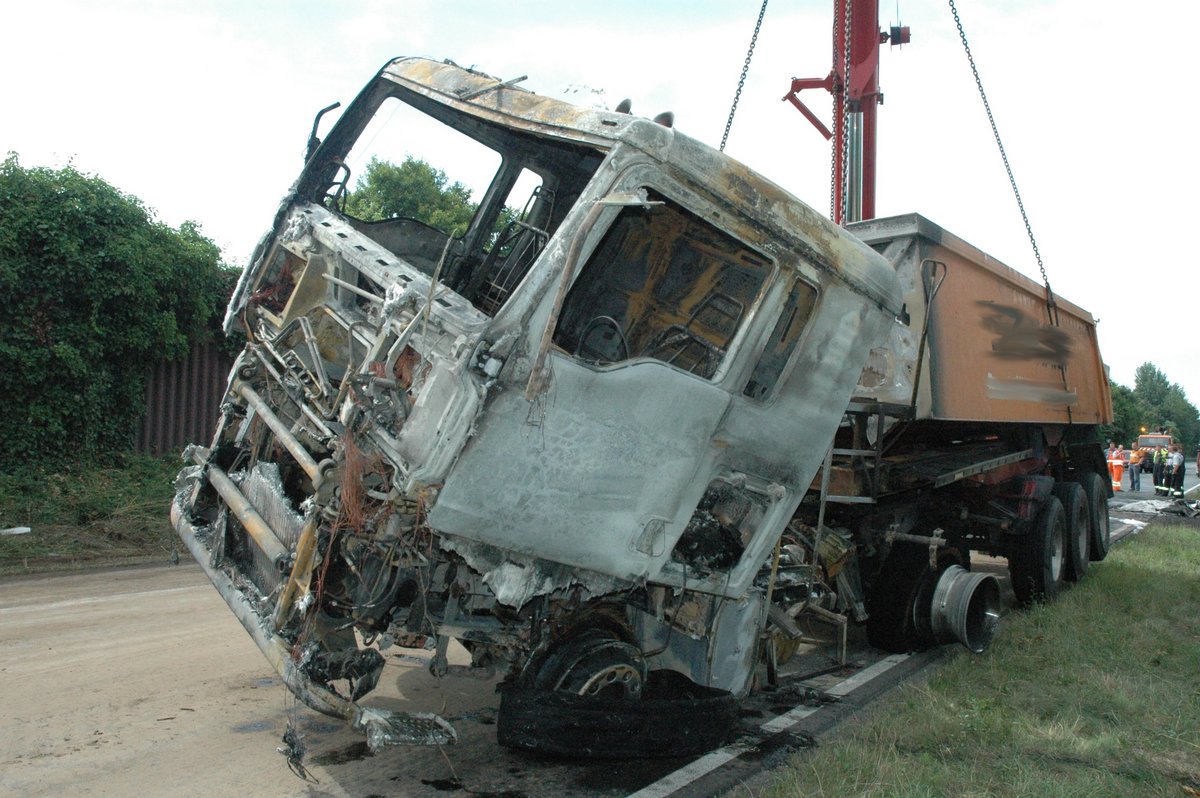 Am Montagmorgen, kurz vor acht, befuhr ein Sattelzug einer Warendorfer Baustofffirma die B 51 in Richtung Münster. Kurz hinter der Kreuzung mit der L 811 (Richtung Westbevern und Innenstadt) geriet der 38 -jährige Fahrer aus Ennigerloh aus noch ungeklärten Gründen nach rechts von der Fahrbahn ab und kam auf den unbefestigten Seitenstreifen. Beim Wiedereinscheren nach links auf die asphaltierte Strecke geriet das LKW-Gespann ins Schleudern, rutschte über die Gegenfahrbahn bis auf die linke Grasnarbe. Schließlich kippte der Sattelauflieger um, während das Zugfahrzeug stehen blieb. Die Ladung, bestehend aus rund 20 Kubikmetern Mutterboden verteilte sich auf der Straße, das Führerhaus geriet in Brand.
