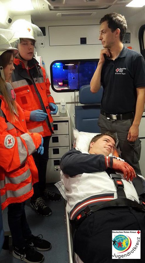 Die Jugendfeuerwehr übernahm die Herzrhythmusmassage. So konnte sich ein JRK'ler auf das Beatmen des Patienten konzentrieren während andere dem Notarzt assistierten oder Absprachen mit der Leitstelle trafen, welches Krankenhaus aufnehmen kann.