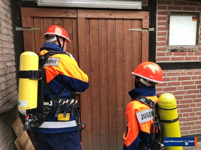 Die Jugendlichen bauten einen Löschangriff auf und bereiteten sich auf einen Innenangriff vor. Die Mannschaft der Drehleiter sowie eines weiteren Löschfahrzeuges baute die Wasserversorgung auf und statteten die Drehleiter mit einem Wenderohr aus.