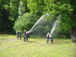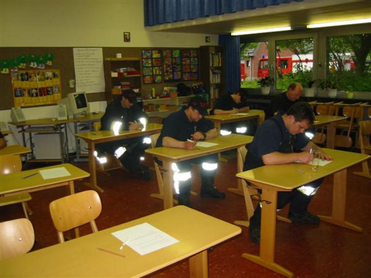 Beim feuerwehrtechnischen Teil war ein Löscheinsatz vorzuführen. Pumpe anschließen, Schläuche verlegen und zielgenau spritzen. Da kamen die Feuerwehrmänner und Feuerwehrfrauen ins Schwitzen, denn auch hier gab es ein Zeitlimit. Richtig ins Schwitzen kam so mancher bei der Theorie. Da ging es darum, welche Löschmittel eingesetzt werden dürfen oder mit welchem Atemgift in der Kanalisation zu rechnen ist.