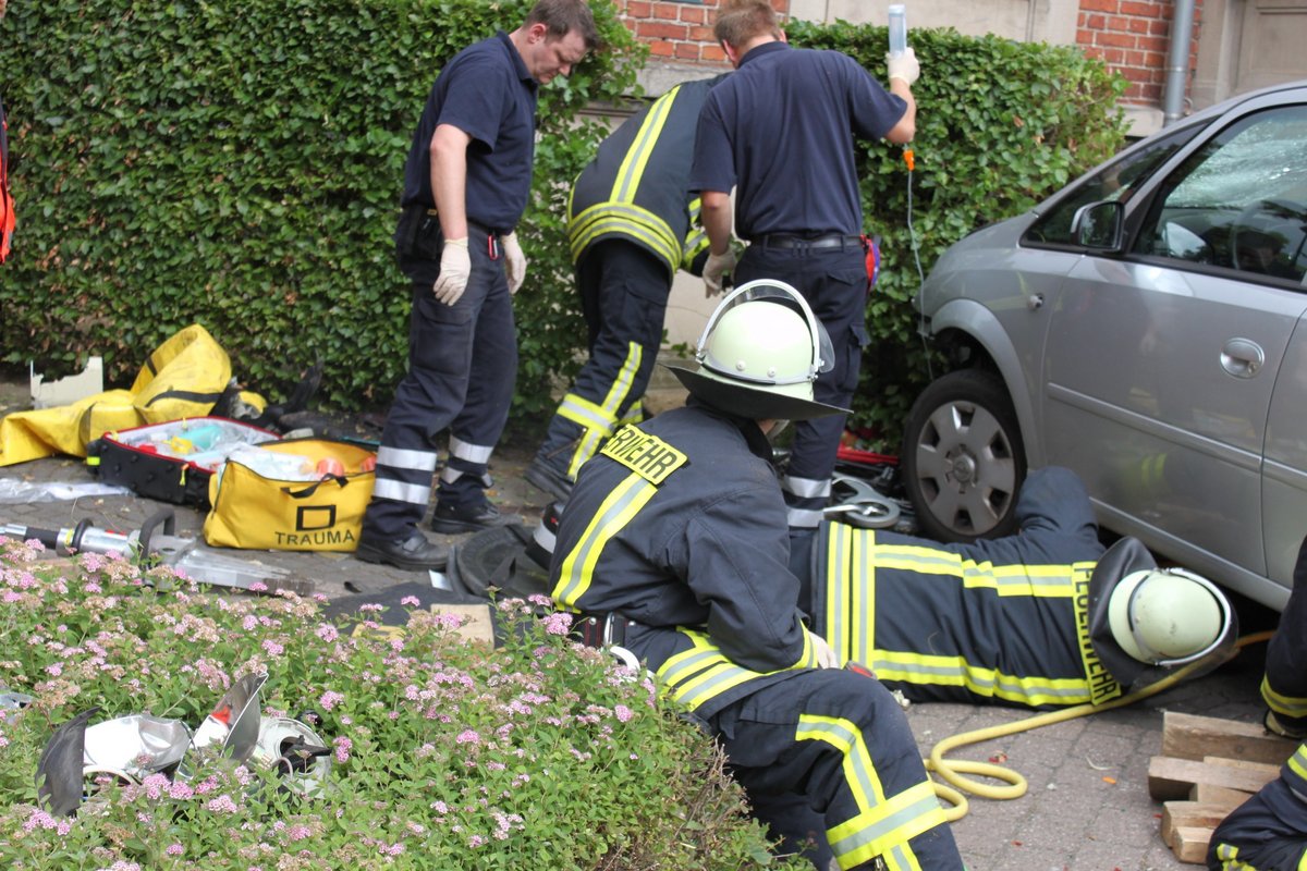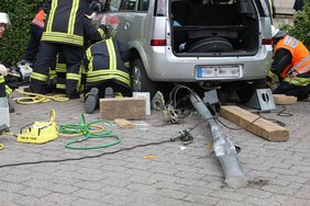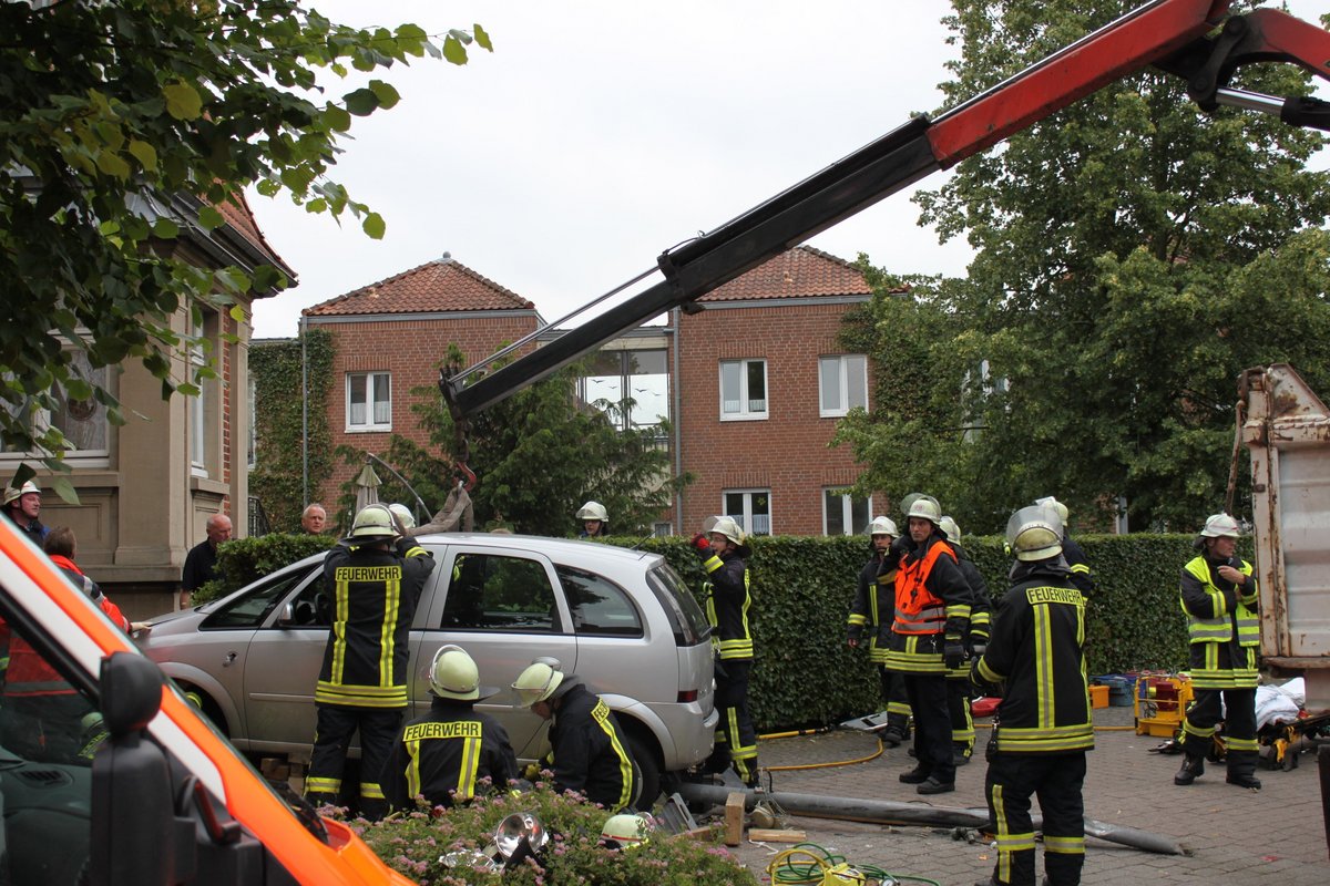 Den sofort eintreffenden Rettungskräften gelang es zunächst nicht, den Mann zu befreien, der am Unfallort von einem Notarzt versorgt wurde. Die Feuerwehr forderte einen Kranwagen aus Münster an. Ehe dieser vor Ort war, hatte jedoch bereits ein Fahrzeug des Telgter Baustoffhandels die Unglücksstelle erreicht. So gelang es, den Unfallwagen anzuheben. Der Radfahrer, der nach Auskunft der Polizei ansprechbar war, wurde mit einem Rettungshubschrauber in die Uniklinik geflogen. Er soll massive Beinverletzungen haben.
