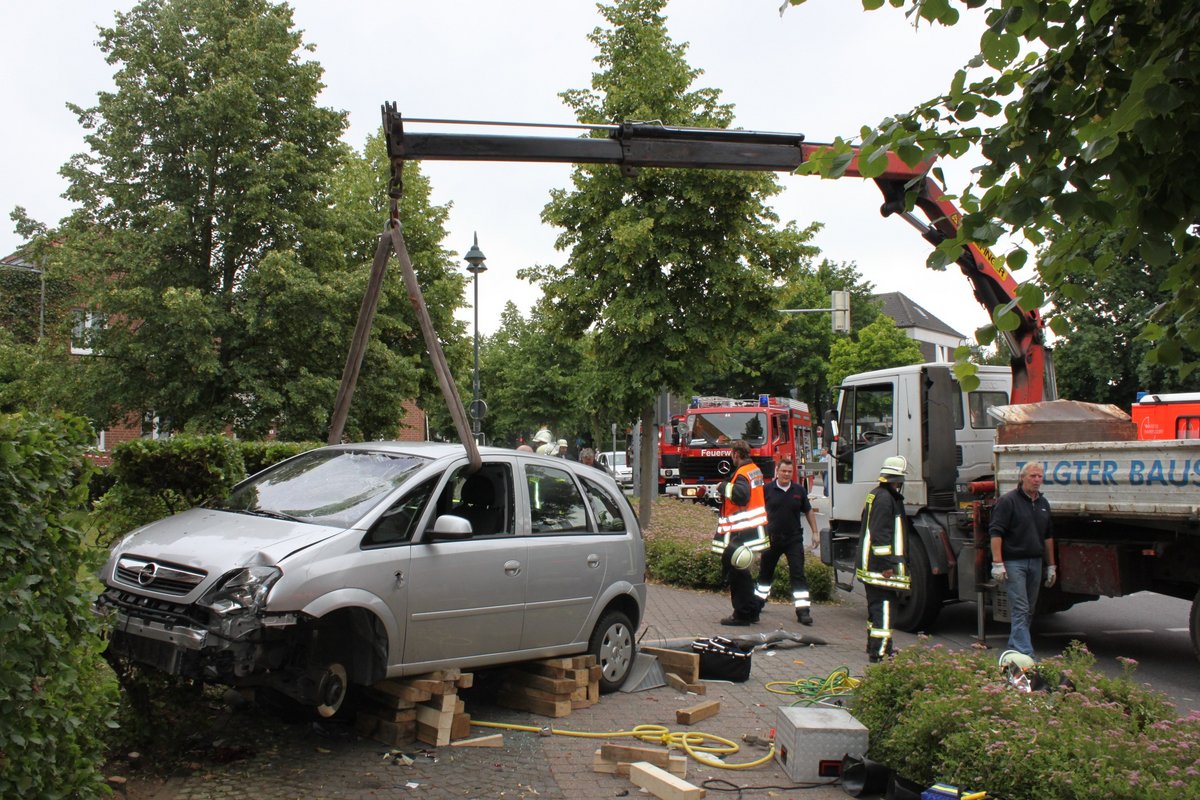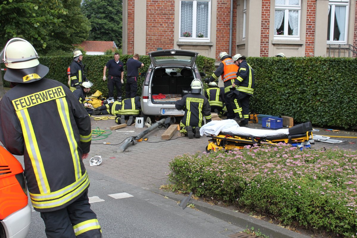 Ein schwerer Verkehrsunfall ereignete sich gestern Nachmittag im Bereich der Kreuzung Baßfeld/Steintor. Dabei wurde ein 67-jähriger Radfahrer aus Telgte schwer verletzt. Der Mann war an der Ampel beim Überqueren der Straße frontal von dem Pkw einer 70-jährigen Telgterin erfasst worden. Die Frau war von links eingebogen und überfuhr auch einen Ampelmasten, ehe ihr Wagen in der Hecke des Emilienhauses zum Stehen kam. Der Radfahrer wurde unter dem Wagen eingeklemmt. Die Autofahrerin erlitt einen Schock.