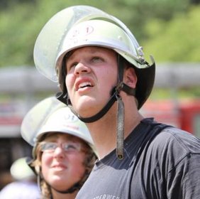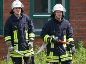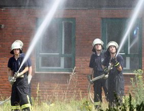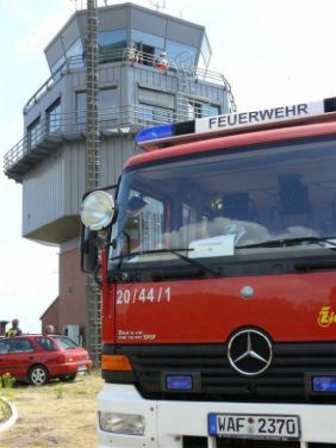 Den „Verletzten“ auf dem Tower geht das natürlich nicht schnell genug. „Ich kann euch sehen, wo bleibt die Leiter“, schreit der schwer verletzte Fluglotse, der sich auf ein umlaufenden Gitter gerettet hat. In schwindelnder Höhe haben ihm die Flammen den Weg nach unten abgeschnitten. Ein Löschzug macht sich auf den Weg, hat allerdings nach dem Erstangriff mit dem Wassernachschub zu kämpfen. 3 Kilometer Schläuche müssen die Kollegen bis zu einem Bach legen. Und die Drehleiter? Die lässt auf sich warten, rauscht dann endlich an. „Feuerwehr Münster“ steht auf der Fahrertür.