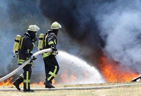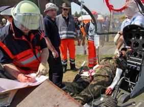 Doch es sollte nicht der einzige Unglücksort sein, an dem die Helfer an diesem heißen Julitag gefordert werden. In einer Ecke des Flugplatzes schießen Stichflammen in den tiefblauen Himmel. Ein Alouette-Kleinhubschrauber ist durch den notgelandeten CH 53-Helikopeter in Brand geraten und hart auf der Piste aufgesetzt. Den Helfern bietet sich hier – dank der Mimen der DLRG – ein Bild des Schreckens. Schwerstverletzte, teils mit großflächigen Brandwunden, gilt es zu versorgen. Und überdies ist auch noch eine Heizzentrale in unmittelbarer Nachbarschaft in Brand geraten. Atemschutz muss eingesetzt werden, um Menschen aus dessen Innenraum zu retten. Die Feuerwehrleute gehen an ihre Grenzen.