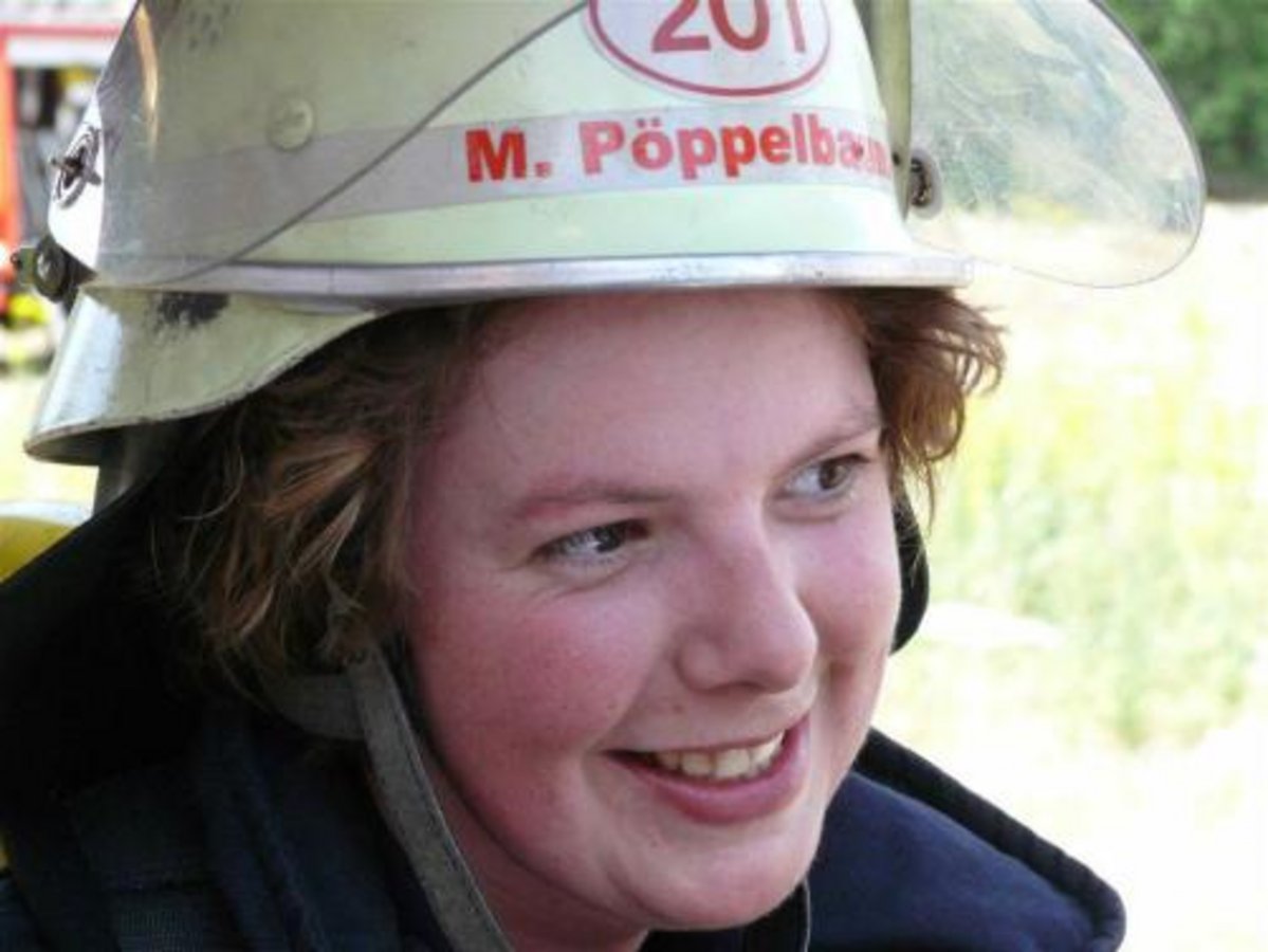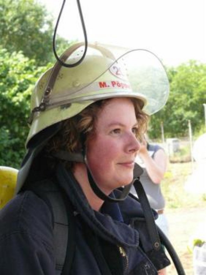 „Feuerwehr Sendenhorst“ auf der des Löschfahrzeugs gleich nebenan. Im Schatten des Feuerwehrautos nimmt Marina Pöppelbaum die Atemschutzmaske ab, und holt tief Luft. Sie hat mit einem Kameraden versucht, in den Tower zu gelangen – vergeblich. Jetzt hilft nur noch die Leiter. Routiniert wird das Rettungsgerät vorbereitet.