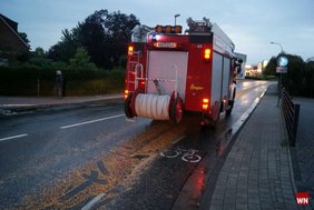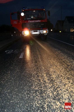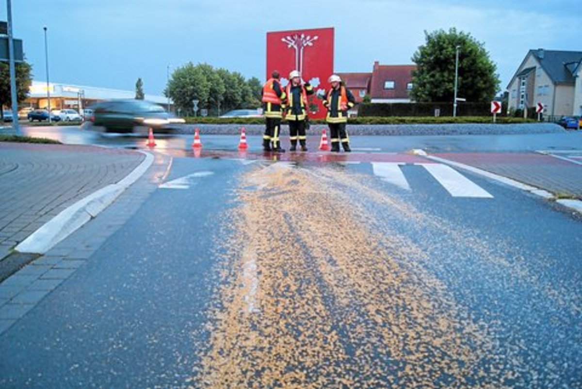 Vom Orkotten-Kreisel bis zum Penny-Markt war die gesamte Fahrbahn mit Körnern bedeckt. Aufgrund eines kurz zuvor niedergegangenen Regenschauers quellte der Weizen auf. Die Folge: Das Ganze wurde zu einer Rutschbahn.