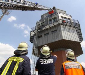 „Die Jungs stehen jetzt ganz schön unter Adrenalin“, erläutert Dr. Sommer vom Kreis. Aber sicherlich nicht so wie die sich wild gebärdende Tower-Besatzung, die immer vehementer Hilfe einfordert. Einer beugt sich gar soweit übers Geländer, dass er fast hinabzustürzen droht. Wehrleute versuchen zu beruhigen, dann schraubt sich endlich die Leiter in den Himmel, erreicht die Brüstung des Towers – die Retter sind da.