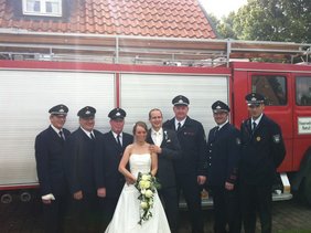 Bei Ihren ersten gemeinsamen Schritten standen die Kameradinnen und Kameraden der Feuerwehr Telgte zur Seite und beglückwünschten das junge Eheglück.