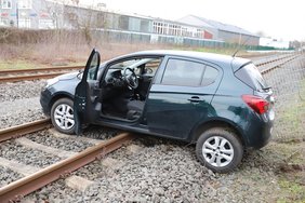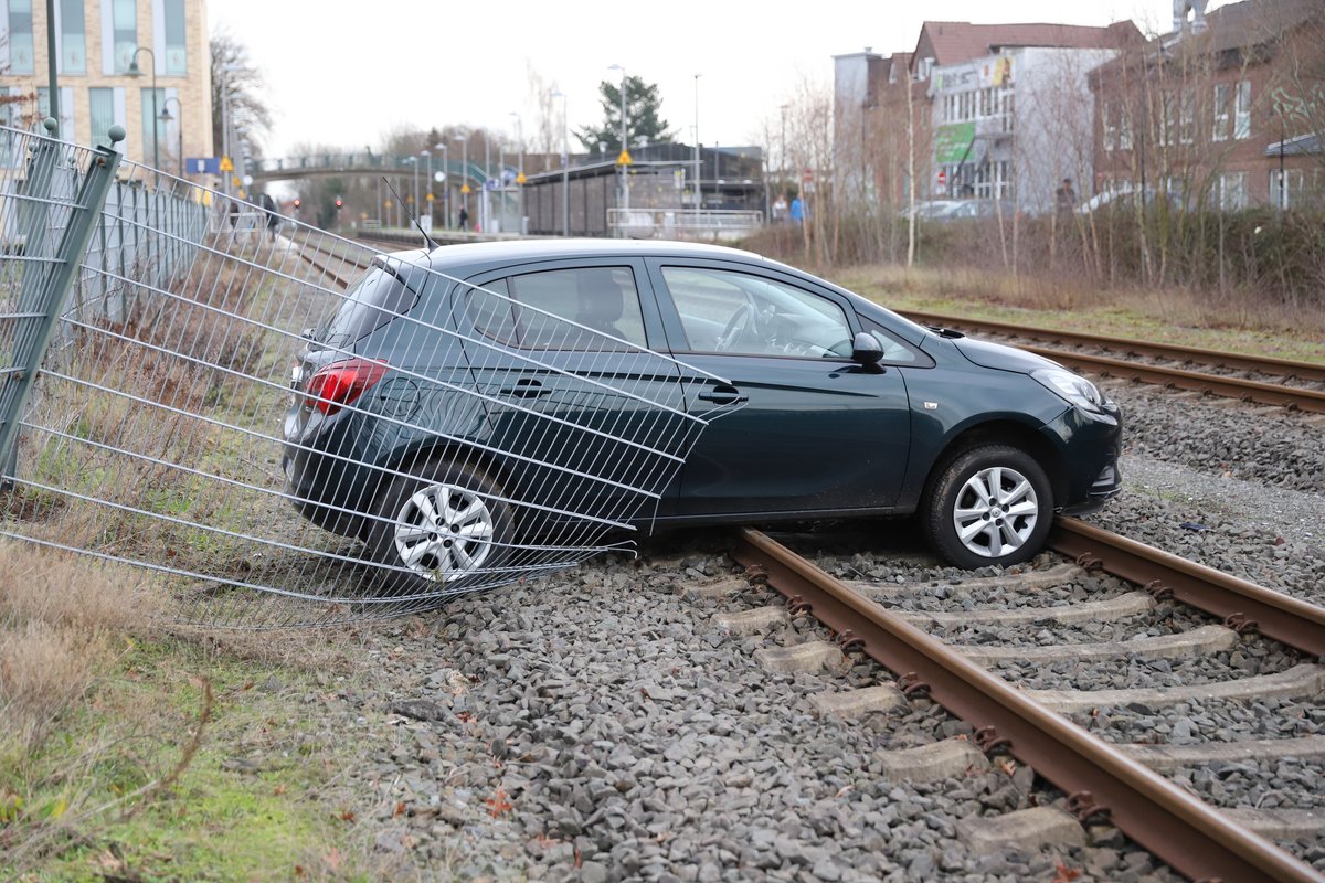 Ein PKW Fahrer durchbrach aus noch nicht geklärter Ursache beim vermutlichen Ausparken aus einer Parklücke des Seitenstreifens der Clemensstraße einen Zaun und kam auf den Gleisen zum Stehen.