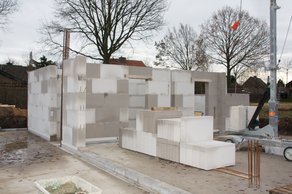 Die Rückwände der Fahrzeughalle im Bereich der Umkleiden entstehen.
