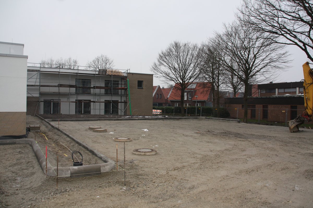 Außen sind mittlerweile die Randsteine gesetzt und die Parkflächen sichtbar.