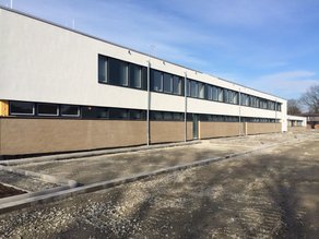 Die Außenarbeiten sind fast komplett abgeschlossen, es fehlt die Teerdecke auf dem Vorplatz. Parkplätze und Einfahrt dahin, sowie Terasse und Haupteingang sind fertig, die hintere Lärmschutzwand ist ebenfalls fast komplett fertig.