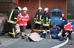 Nach kurzer Zeit sind die zwei Vermissten verletzt aus dem Gebäude geborgen, alle Wasserleitungen gelegt und die Drehleiter ist ausgefahren. Die Wehr hat alles im Griff, und Udo Bubbel ist zufrieden: „Die Übung hat gut funktioniert, aber natürlich könnten Kleinigkeiten immer noch besser laufen.“Die Feuerwehr übt drei bis vier Mal im Jahr in großer Besetzung einen Einsatz. Die Wehrmänner wussten zwar auch am Montag, dass eine Übung stattfindet, welches Szenario sie erwartet, war ihnen aber nicht bekannt. Kann man trotzdem einen Einsatz überhaupt wirklichkeitsnah simulieren? „Wir versuchen, es so realistisch wie möglich zu machen. So war es zum Beispiel jetzt in der Firmenhalle dunkel, und die Alarmsirene heulte laut. Auf diese Weise versuchen wir, den Stress zu simulieren, den die Kameraden auch in einem echten Einsatz erfahren“, so Bubbel. Ganz stressfrei konnten die Feuerwehrmänner nach getaner Arbeit wieder abrücken.